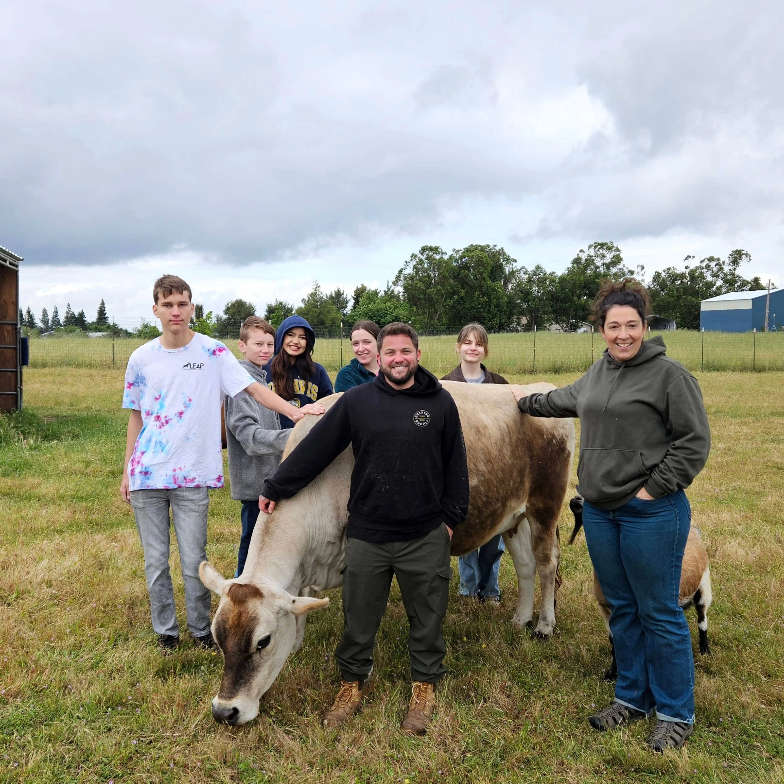 We got Dusty when he was only one day old. His mom died right after he was born on a farm in Petaluma. The farmer reached out to Genevieve's Gentle Hearts Rescue to surrender him. He battled joint infections and spent a lot of time at UC Davis hospital, but he's now a growing boy and doing great.