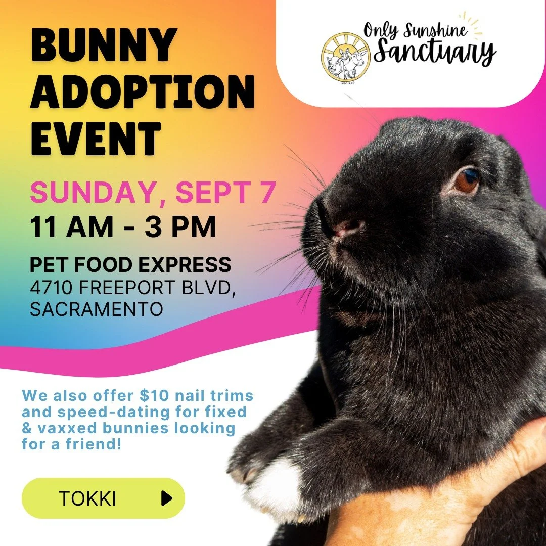 Join us for a bunny adoption event at Pet Food Express every first Sunday of the month! View our adoptable rabbits at onlysunshine.me/adopt. Bring your fixed bunny for bunny speed-dating! We also offer $10 nail trims, or free if you adopted from us.