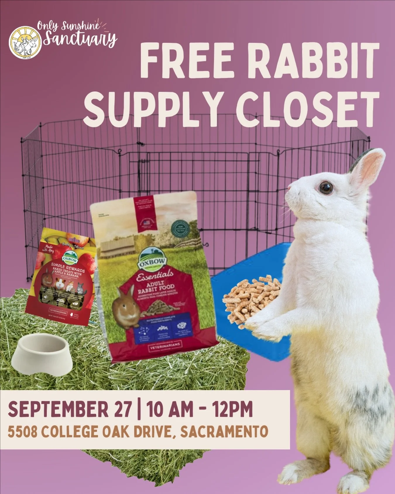 ☀️ Only Sunshine Sanctuary is hosting our free Rabbit Food and Supply Closet on Saturday, September 27, from 10 AM to 12PM.