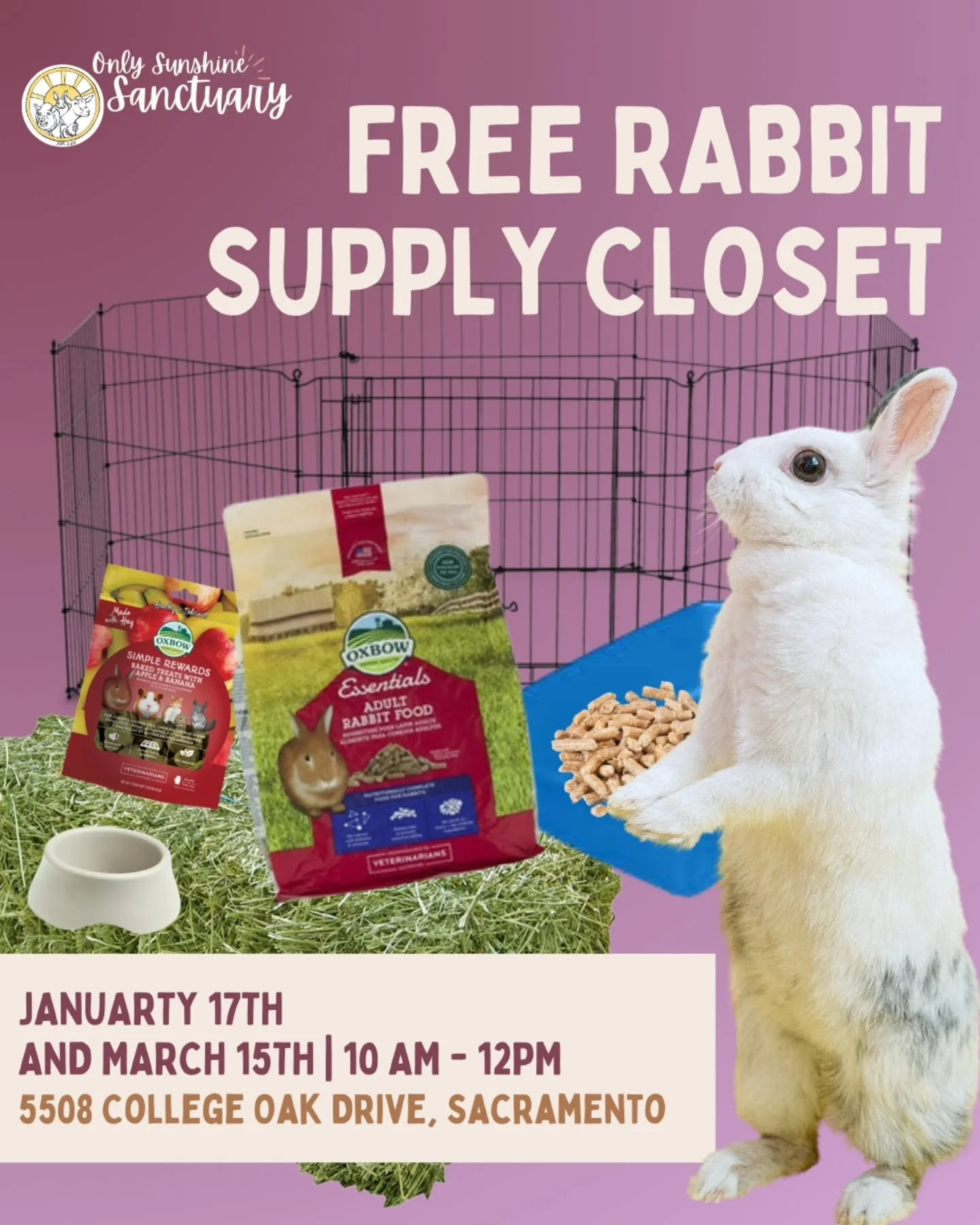 Only Sunshine Sanctuary is hosting our free Rabbit Food and Supply Closet on Sunday, January 25th, from 10 AM to 1 PM.