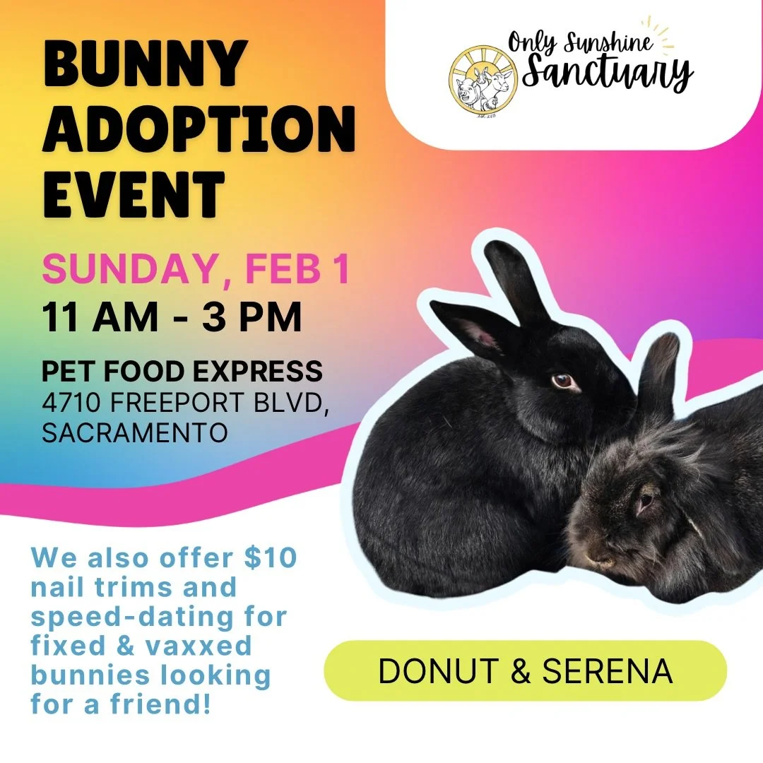 The bunnies of Only Sunshine Sanctuary will be at Pet Food Express for adoption. Come out and find some bunny to love. If you have a fixed bunny, we can help your bunny find a soulmate.